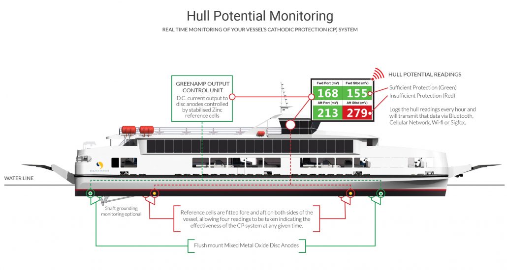 GreenAmp Marine is an Impressed Current Cathodic Protection system (ICCP) for ship’s hulls bearing where the amount of protective current is controlled automatically to maintain accurately at all times a pre-set level of protection. The GreenAmp Marine system can be remotely monitored and is unique in that it data logs operational and protection levels.