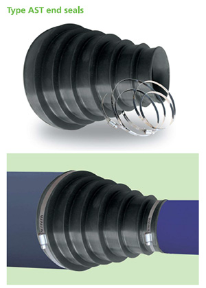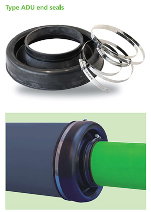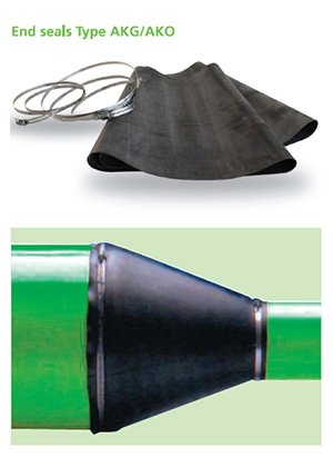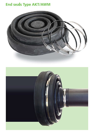 Elastomeric casing-end seals serve as pressure-less sealing of the annular space between casing pipe and carrier pipe. To protect the carrier pipe against corrosion, the inside of the casing pipe has to stay dry. End seals are especially suitable for retrofit mounting and also for new constructions because they can be delivered individually (basic, multiple, conic, and split version). End seals 4pipes are closing the annular space at the end of the casing pipes towards the carrier pipe against dirt and moisture. For pressure tight applications special measurements have to be taken e.g. type KMR.